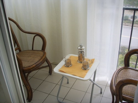 透過(guò)紗簾看小小的陽(yáng)臺(tái)