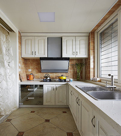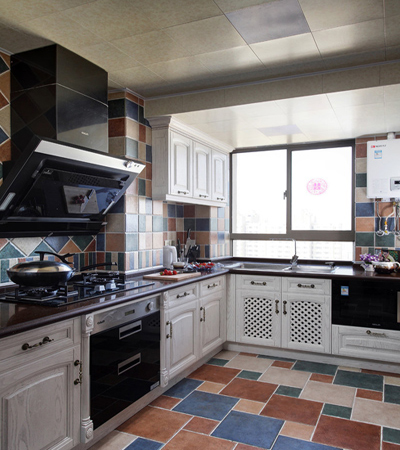 寬敞明亮的廚房。復(fù)古的地中海風(fēng)地磚與櫥柜顯出清爽,側(cè)吸的油煙機黑色板面時尚大氣。