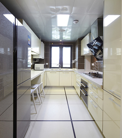 彷佛進入虛擬的空間,廚房用的是玻璃移門,長條形的廚房足夠轉(zhuǎn)身操作就好,簡約得體又實用。
