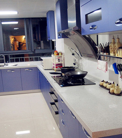 其實白色的吸塑櫥柜與藍(lán)色的石英石臺面,結(jié)合得相當(dāng)美。