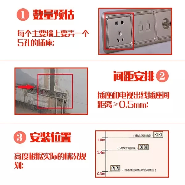 客廳與臥室的插座,應(yīng)保證每個(gè)主要墻面均有一個(gè)5孔插座,以滿足日常生活所需。插座的位置應(yīng)根據(jù)房屋的設(shè)計(jì)來確定,如電視背景墻位置的插座可適當(dāng)多一些,其他位置的根據(jù)需要而定。