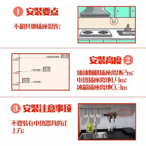 廚房內(nèi)所用電器較多,所以在進(jìn)行電路改造時(shí),一定要想清楚廚房內(nèi)會有哪些電器,具體位置在哪里,想好哪里應(yīng)該預(yù)留電線接口,廚房應(yīng)根據(jù)建筑裝修的布置,在不同的位置、高度設(shè)置多處電源插座以滿足抽油煙機(jī)、消毒柜、微波爐、電飯煲、電熱水器、電冰箱等多種電炊具設(shè)備的需要。這樣就不會留下裝修遺憾。