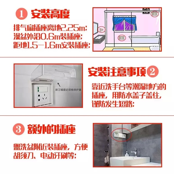 安裝在衛(wèi)生間的插座宜帶開關(guān)和指示燈,如果安裝在潮濕位置的插座,好在插座表面安裝一個(gè)防水的蓋子,避免水汽進(jìn)入插座內(nèi),引起短路。
