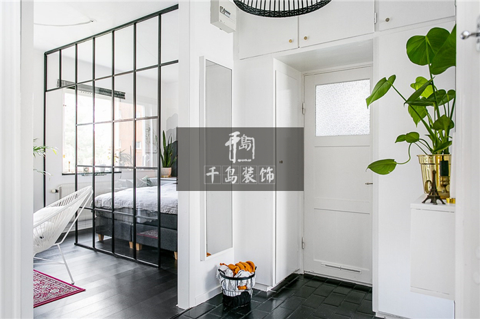 可以明顯看出,客廳與臥室只用了一道黑框玻璃門隔斷,透明光感增加了整體環(huán)境的通透性,但黑色的框線卻強(qiáng)調(diào)了兩個(gè)空間,線條明朗交錯(cuò)之間,既有北歐風(fēng)的自由風(fēng)情,又有輕工業(yè)的規(guī)整有序,這種輕微卻極具沖擊力的混搭效果讓人眼前一亮。
