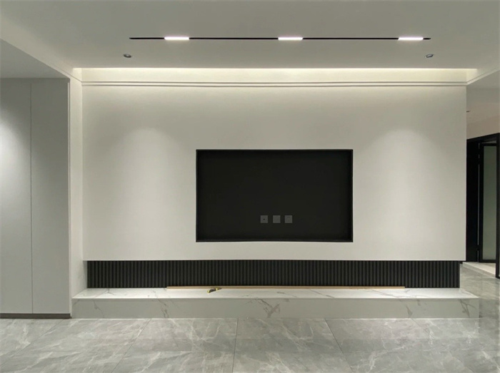 就像這種,在電視背景墻上方用了一組磁吸燈,加上燈帶做輔助光,另外客廳上方各周圍有用防眩射燈做重點照明,亮度完全夠!而且效果也要比普通吸頂燈好很多。
