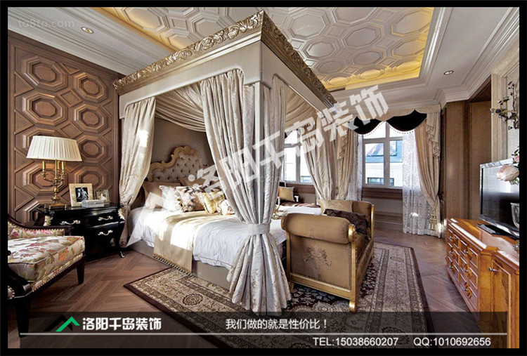 歐式三居室臥室呈現(xiàn)完美的曲線,墻壁和屋頂?shù)牡窕ㄔO計遙相呼應,歐式大床更添富貴奢華。