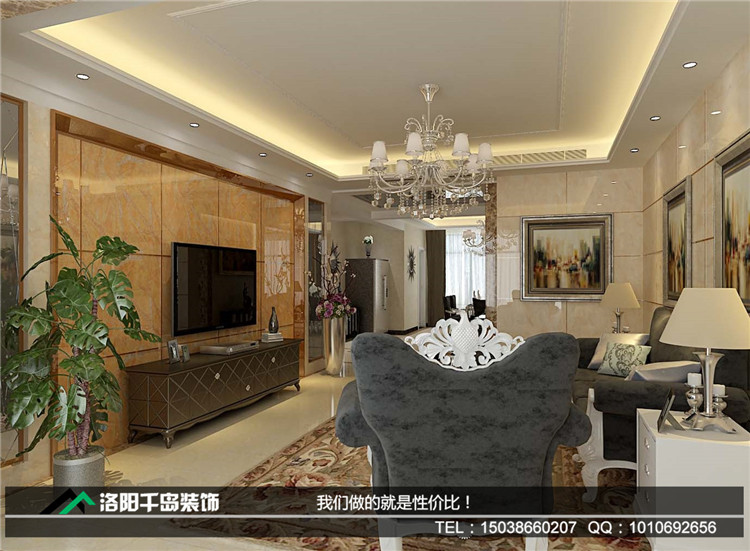 歐式的電視背景墻,選用亮面石材,將大理石被劃分成長(zhǎng)方形塊,光滑的質(zhì)地將墻面襯托得優(yōu)雅奢華。