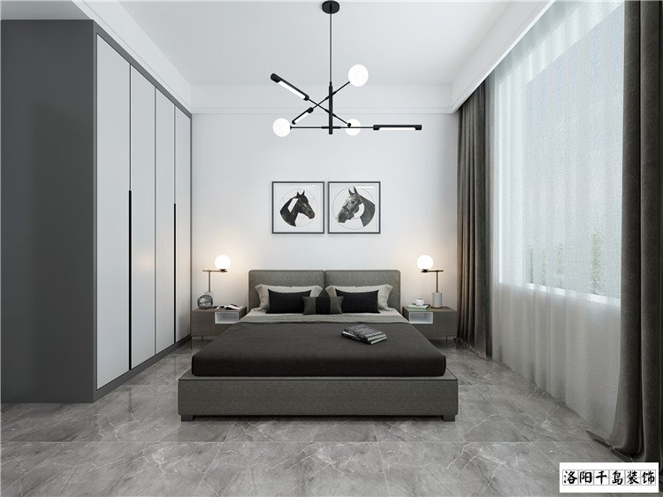 主臥采用典型的黑白灰裝修風(fēng)格,白色整體定制衣柜,滿滿的高級(jí)感,床頭硬包簡(jiǎn)約大方,配上金色的金屬燈具,效果不要太贊了!
