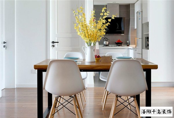 餐廳的空間不大,在廚房與客廳的過渡區(qū),硬裝為白色的墻面,原木色的地板,與整體風(fēng)格契合,既樸實(shí)又簡潔。餐桌選用非常經(jīng)典的北歐風(fēng)格,不刻意修飾的桌面板材,配上粗壯的鐵藝腿部支撐,兼具了時(shí)尚和工業(yè)風(fēng)的格調(diào),再配上造型前衛(wèi)的休閑椅,令這個(gè)空間雖然簡單卻不孤單。桌面用陶瓷花瓶,配上鮮艷的仿真絹花裝點(diǎn),給這塊空間帶來明媚的色彩。