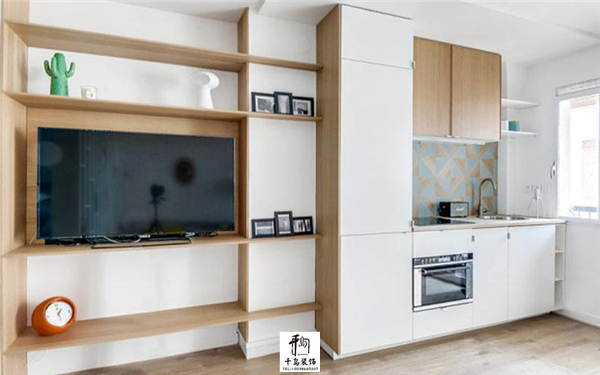 單獨(dú)的看一下這面墻,我覺(jué)得這人能夠利用墻壁裝出這樣的效果,也真是夠有才,這面墻壁不僅是電視墻,也是打造了入墻式的櫥柜,中間做了一個(gè)隔斷設(shè)計(jì),小小的櫥柜確是我們的開(kāi)放式廚房,對(duì)于這種小戶(hù)型而言,這樣的設(shè)計(jì)很省空間,而且格局設(shè)計(jì)我覺(jué)得給滿分。
