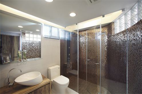 浴室用馬賽克裝飾一整塊墻壁,可能是一種比較奢華的感受。當(dāng)然,馬賽克只是一種裝飾的技巧,我們可以在電視機(jī)的背景墻中增添一橫條,類似于銀鏡的裝修,能起到很好的裝飾效果。