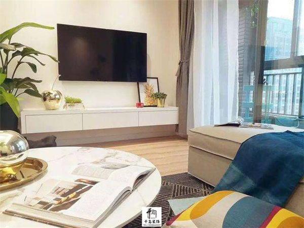 與傳統(tǒng)的落地電視柜不同,這里設(shè)計了懸掛式的白色電視柜,簡約時尚,重要的還實用,旁邊的綠植很搶眼,給家里營造出一個很清新的氛圍;