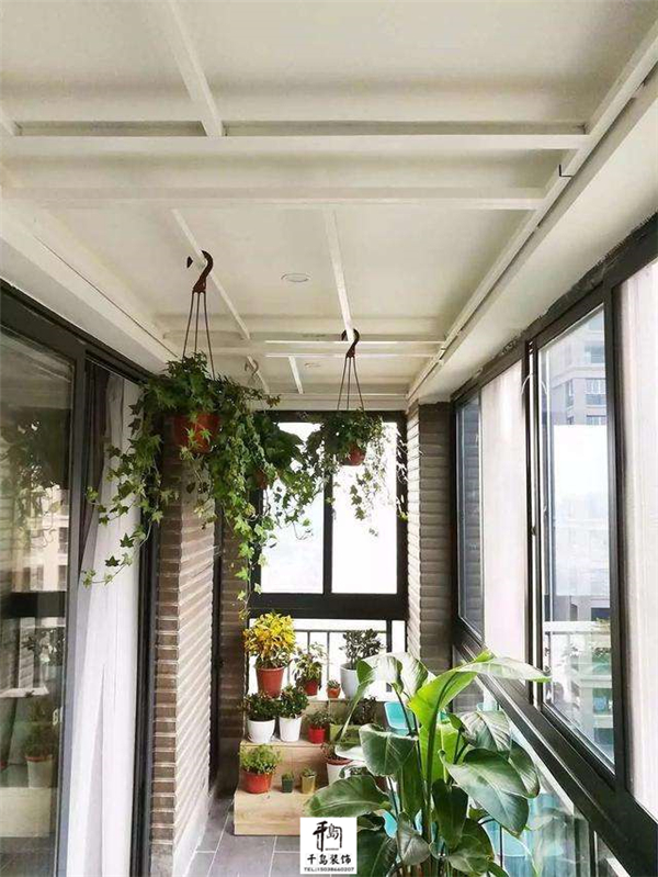 陽臺頂面安裝白色的掛桿,既可以掛盆栽,還可以掛衣服,掛桿可以移動,衣服多時可以移到兩邊,也許,我們家里也可以借鑒這種“掛衣桿”。