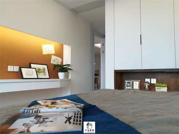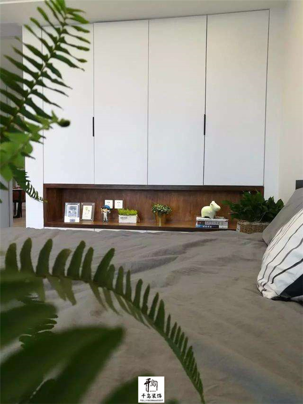 次臥延續(xù)了主臥的設(shè)計,設(shè)計了同款式的衣柜,保證了整屋風格的統(tǒng)一性;